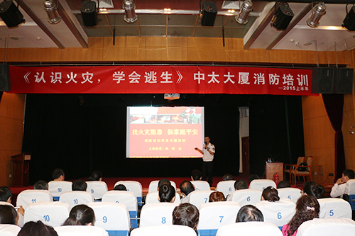 5月15日上午,中太大廈2015年上半年消防培訓在二樓報告廳舉行,邀請石家莊市冀消安防火教育中心宣教處教員程俊磊老師,為大家?guī)砹艘粓鲆浴罢一馂碾[患保家庭安全”為主題的消防知識普及專題講座。