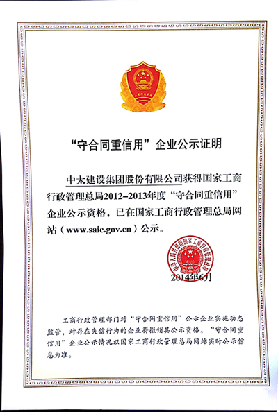 國家工商總局從歷年來各地政府或工商行政管理部門公示的“守合同重信用”企業(yè)中,選出社會誠信度、美譽度高的企業(yè)作為2012-2013年度“守合同重信用”企業(yè)向社會公示,并發(fā)出公告。中太建設(shè)集團(tuán)獲得2012-2013年度“守合同重信用”企業(yè)公示資格。