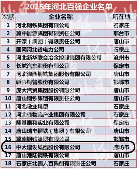 10月,經(jīng)河北省工業(yè)經(jīng)濟(jì)聯(lián)合會、省企業(yè)家協(xié)會、省企業(yè)聯(lián)合會和省統(tǒng)計學(xué)會協(xié)辦層層評選審核、專家評審和社會公示等程序,中太建設(shè)集團(tuán)再次榮膺“河北百強企業(yè)”(第16名),并在“河北省重點行業(yè)排頭兵企業(yè)”排名中榮獲建筑業(yè)第1名。