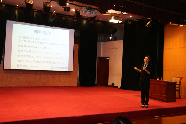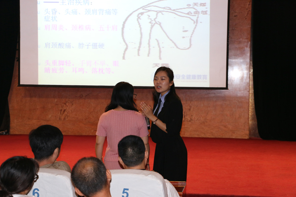 在中國環(huán)境健康與衛(wèi)生安全促進(jìn)會(huì)河北分會(huì)的大力支持下,中國安全健康教育中心河北站特邀講師,全民健康咨詢服務(wù)部,省健康教育專業(yè)委員會(huì)委員,宣傳科講師彭一茹走進(jìn)中太大廈,圍繞CPR現(xiàn)場(chǎng)緊急救護(hù)知識(shí);環(huán)境污染、室內(nèi)污染的危害及防護(hù)知識(shí);經(jīng)絡(luò)穴位養(yǎng)生;常見職業(yè)病的防治;家庭醫(yī)療設(shè)備的正確區(qū)分等內(nèi)容,從實(shí)際案例出發(fā),深入淺出、形象生動(dòng)的剖析健康的重要性以及穴位養(yǎng)生保健的方法,同時(shí)還邀請(qǐng)現(xiàn)場(chǎng)員工代表上臺(tái),與老師合作為現(xiàn)場(chǎng)員工形象的解析了經(jīng)絡(luò)穴位治療的原理及療效。彭一如老師的精彩授課得到了在場(chǎng)員工的一致認(rèn)可。