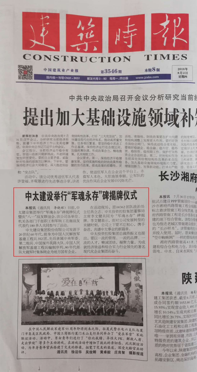 建筑時報8月2日報道了“中太建設(shè)集團(tuán)“軍魂永存”碑揭牌儀式”