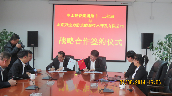 9月6日,中太建設(shè)集團(tuán)第十一工程局與國內(nèi)防水工程行業(yè)知名企業(yè)——北京萬寶力防水防腐技術(shù)開發(fā)有限公司簽署合作協(xié)議,確立了防水工程服務(wù)戰(zhàn)略合作伙伴關(guān)系。十一局局長馬功云、副局長陳可偉、吳夕強以及萬寶力公司董事長王力共同出席了此次簽約儀式。