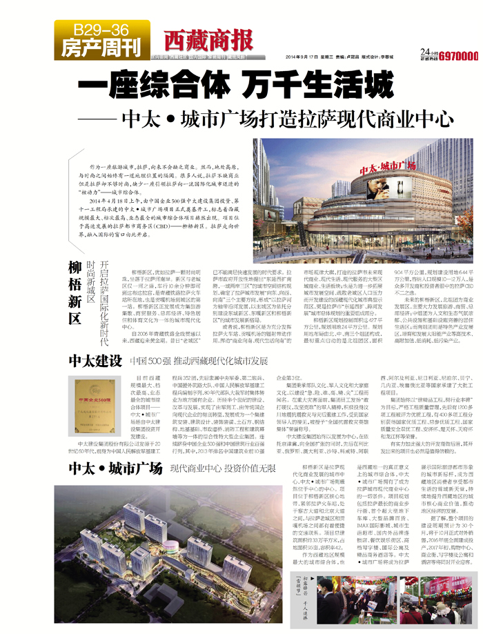 2014年4月18日上午,由中國企業(yè)500強中太建設集團投資、第十一工程局承建的中太·城市廣場項目正式奠基開工,標志著西藏規(guī)模最大、檔次最高、業(yè)態(tài)最全的城市綜合體項目赫然出現。項目位于高速發(fā)展的拉薩都市商務區(qū)(CBD)——柳梧新區(qū)。拉薩走向世界,融入國際的窗口由此開啟。